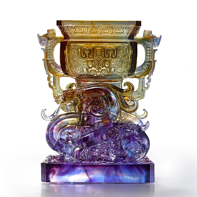 作品取材自唐代「赤金走龍」,延續傳統青銅器的造型,以細緻的琉璃蟠龍雕飾,展現其尊貴、雍容之氣度。