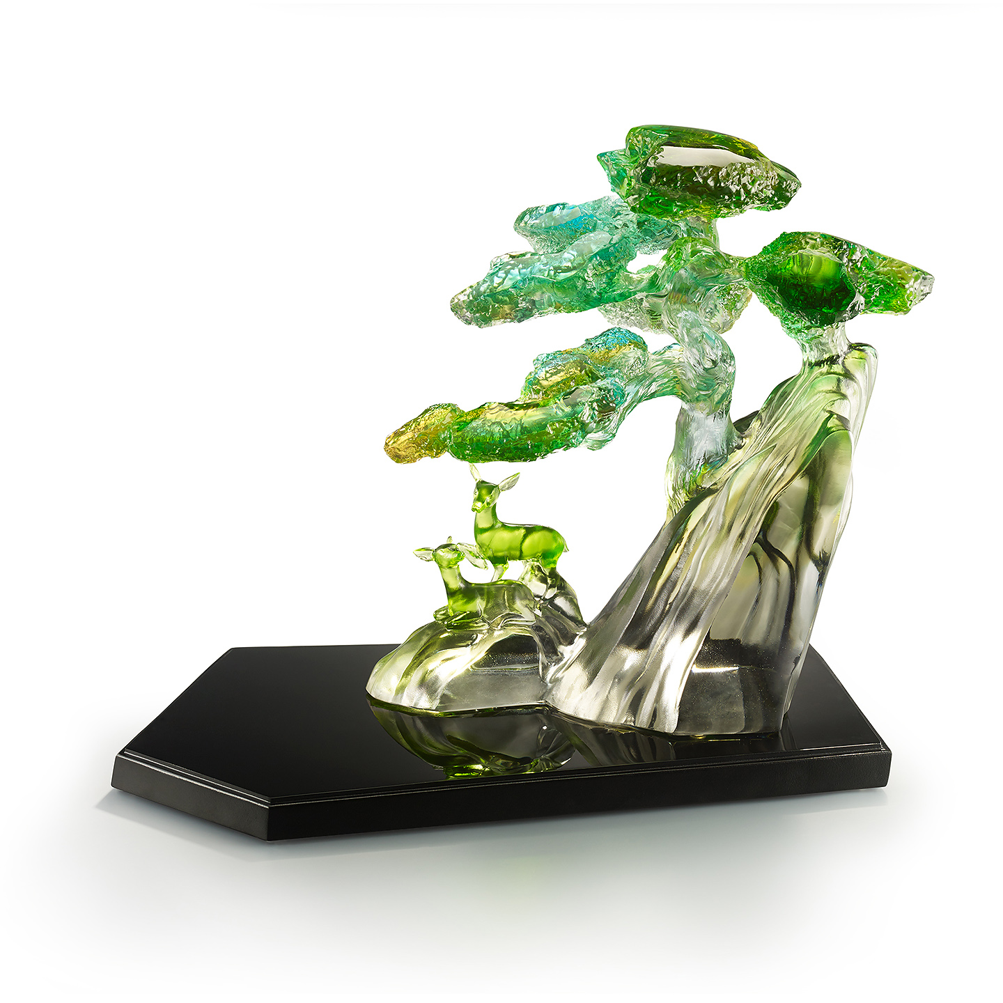 In Chinese culture, the rock symbolizes strong positioning, while the pine means a spirit of no fear to power and authority. Engaging the glistening characteristic of glass to the rock and pine, this artwork conveys the unique morality of Chinese scholars.